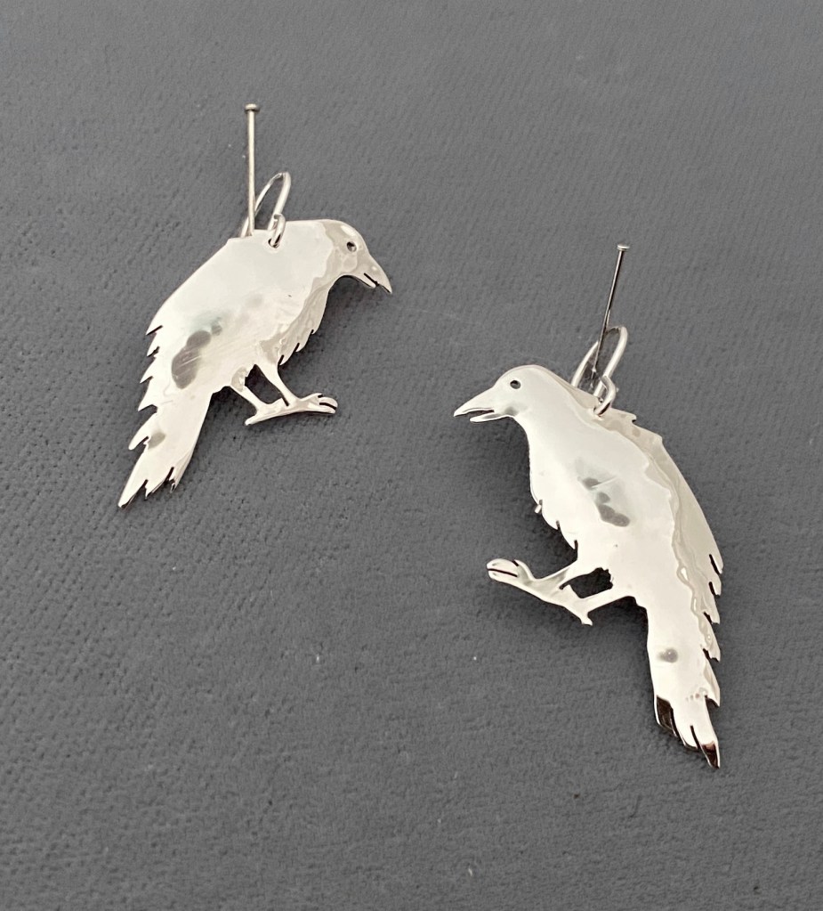 Your guess is as good as mine. Let’s just say these are my new corvid earrings in sterling silver. They’ll be featured in my work at the Holiday Art & Gift Show at Trail’s End Art Association this weekend in Gearhart. I’ve recently become aware that there are a lot of corvid lovers out there and I thought it would be fitting to include them in my latest collection of sterling silver jewelry.